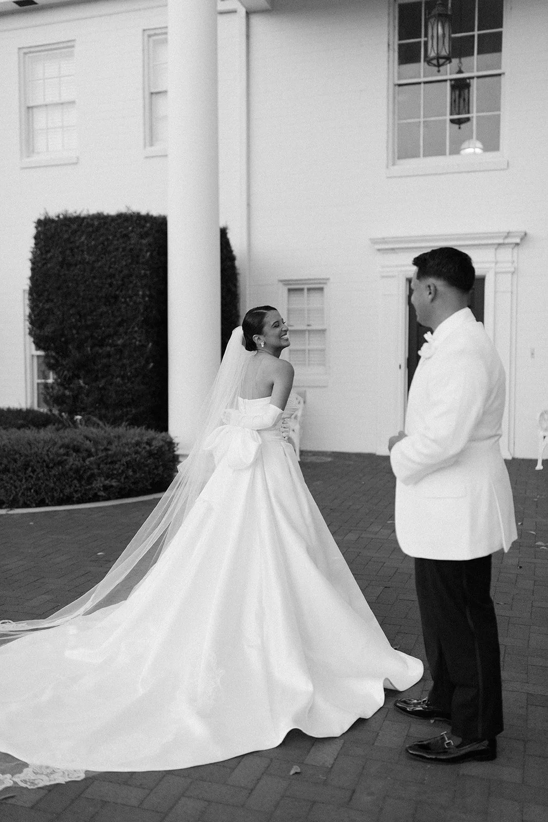 Elegant and timeless, this custom-designed wedding gown features a high-neck satin silhouette paired with a delicate lace-trimmed cathedral veil. Captured under romantic archways, this look exudes sophistication and grace.
