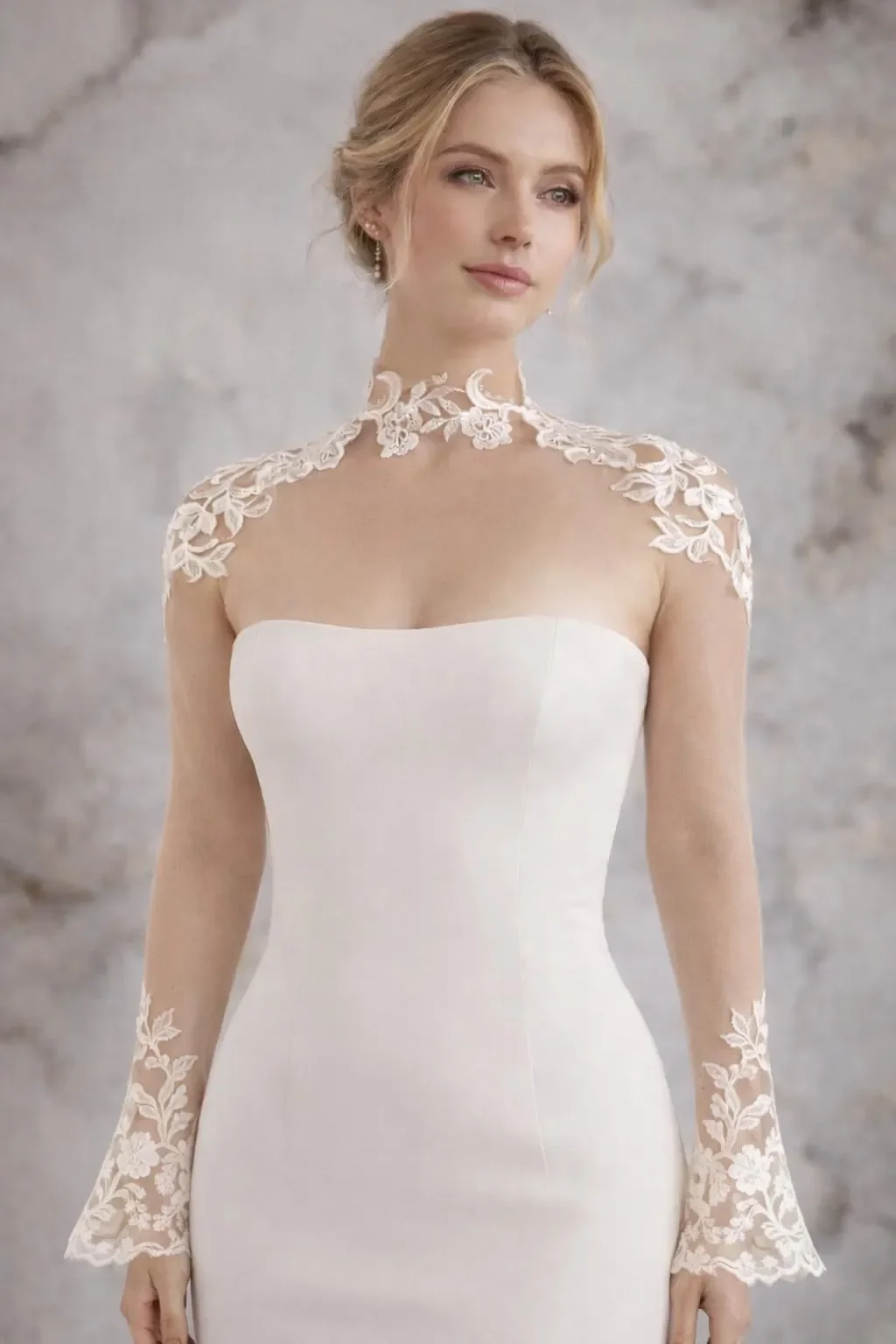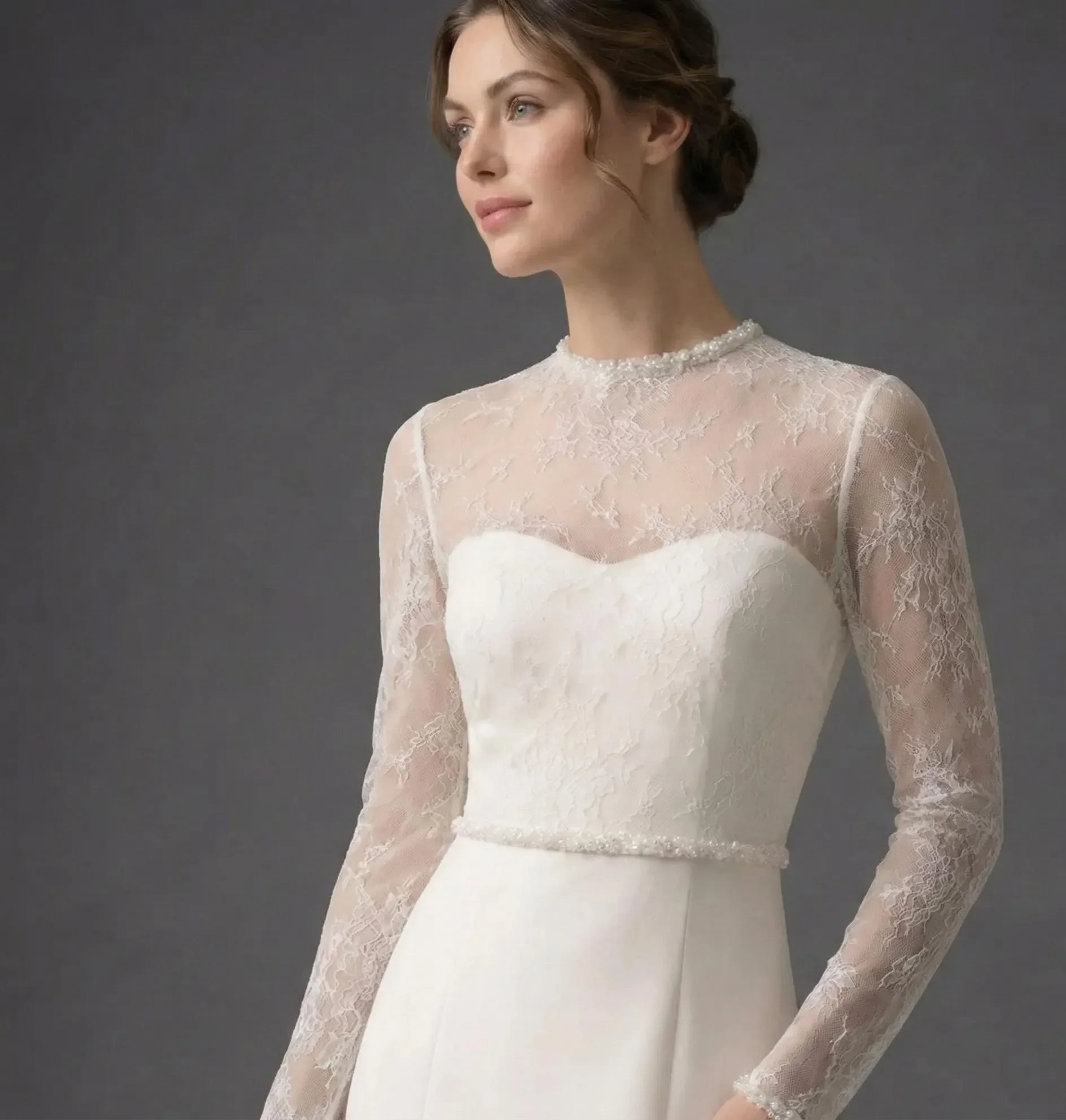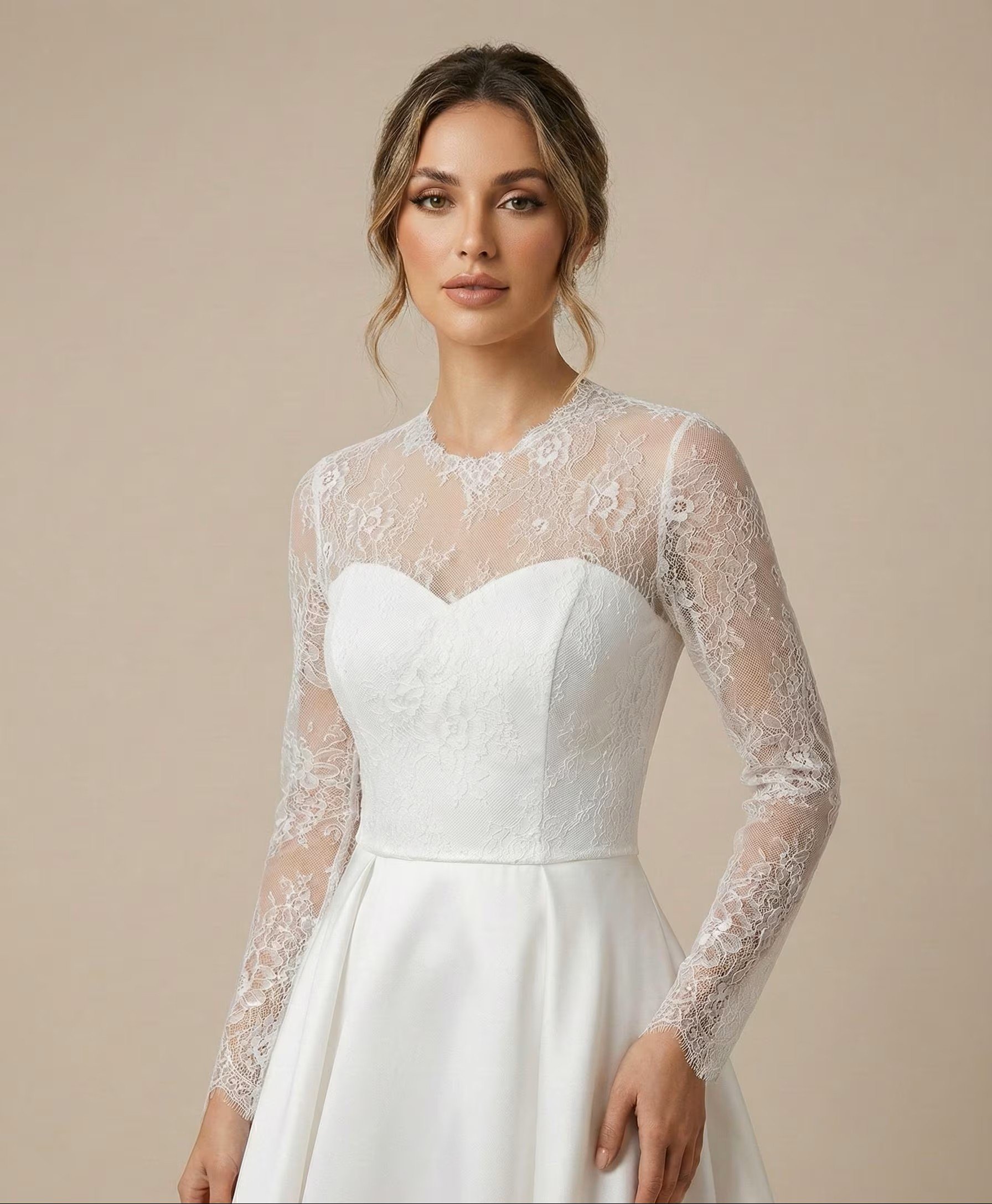 A detachable bridal topper allows brides to add sleeves, coverage, or intricate detail for the ceremony, then remove it for the reception. From long sleeve lace bridal toppers to illusion necklines and romantic overlays, each design is made to order and custom fitted to your dress.