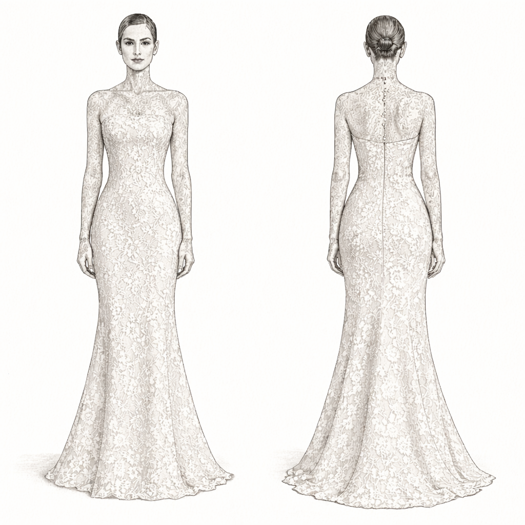 Minimalist custom wedding dress featuring a fitted silhouette and clean couture lines, tailored to the bride’s measurements.